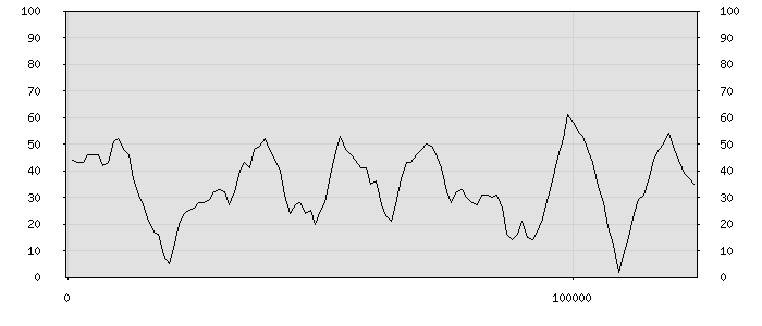 (по горизонтали: счётчик знаков; по вертикали: процент диалогов; размер скользящего окна: знаков, шаг: 1000 знаков) |