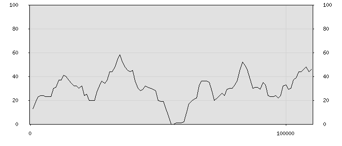 (по горизонтали: счётчик знаков; по вертикали: процент диалогов; размер скользящего окна: знаков, шаг: 1000 знаков) |