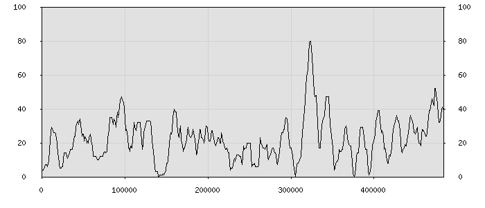 (по горизонтали: счётчик знаков; по вертикали: процент диалогов; размер скользящего окна: знаков, шаг: 1000 знаков) |