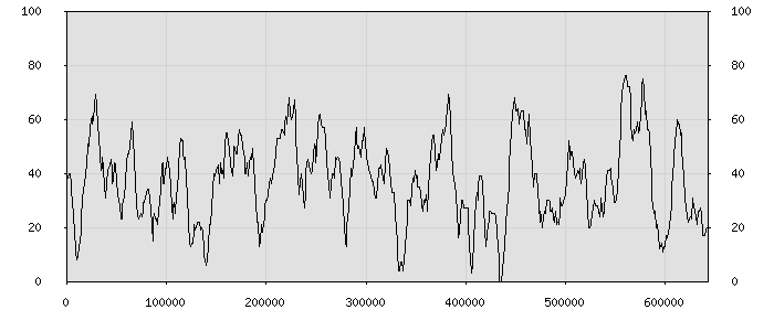 (по горизонтали: счётчик знаков; по вертикали: процент диалогов; размер скользящего окна: знаков, шаг: 1000 знаков) |