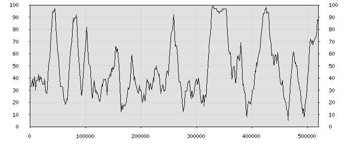 (по горизонтали: счётчик знаков; по вертикали: процент диалогов; размер скользящего окна: знаков, шаг: 1000 знаков) |