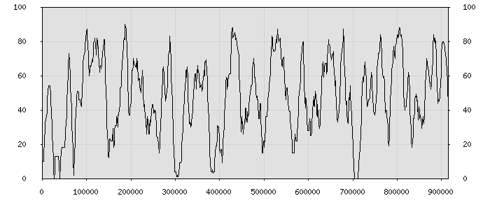 (по горизонтали: счётчик знаков; по вертикали: процент диалогов; размер скользящего окна: знаков, шаг: 1000 знаков) |