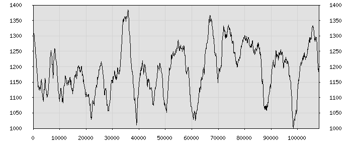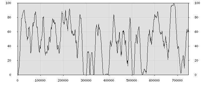 (по горизонтали: счётчик знаков; по вертикали: процент диалогов; размер скользящего окна: знаков, шаг: 1000 знаков) |