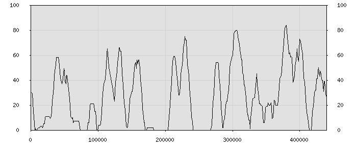 (по горизонтали: счётчик знаков; по вертикали: процент диалогов; размер скользящего окна: знаков, шаг: 1000 знаков) |