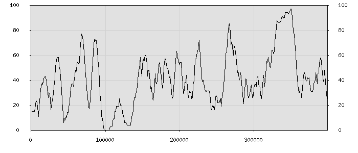 (по горизонтали: счётчик знаков; по вертикали: процент диалогов; размер скользящего окна: знаков, шаг: 1000 знаков) |