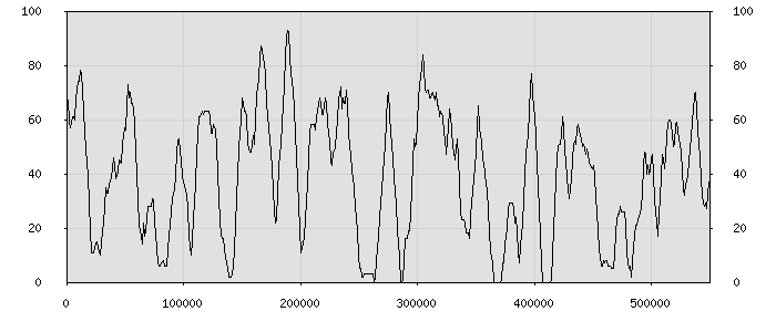 (по горизонтали: счётчик знаков; по вертикали: процент диалогов; размер скользящего окна: знаков, шаг: 1000 знаков) |