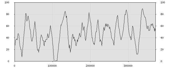 (по горизонтали: счётчик знаков; по вертикали: процент диалогов; размер скользящего окна: знаков, шаг: 1000 знаков) |
