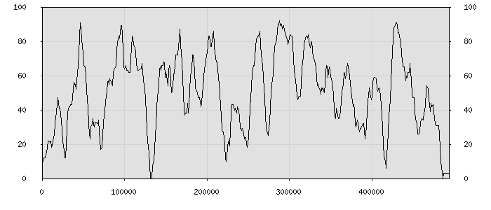 (по горизонтали: счётчик знаков; по вертикали: процент диалогов; размер скользящего окна: знаков, шаг: 1000 знаков) |