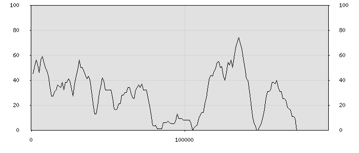 (по горизонтали: счётчик знаков; по вертикали: процент диалогов; размер скользящего окна: знаков, шаг: 1000 знаков) |