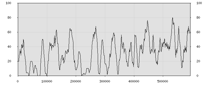(по горизонтали: счётчик знаков; по вертикали: процент диалогов; размер скользящего окна: знаков, шаг: 1000 знаков) |