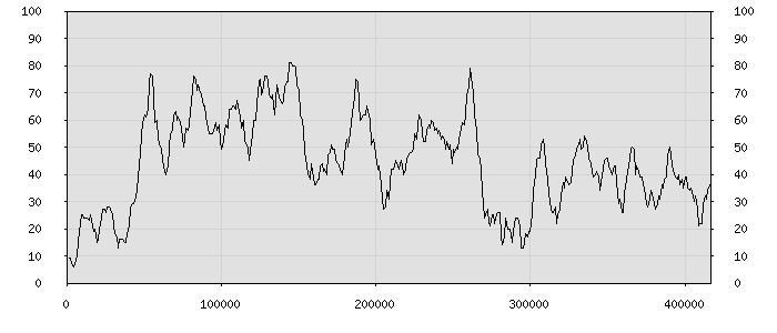 (по горизонтали: счётчик знаков; по вертикали: процент диалогов; размер скользящего окна: знаков, шаг: 1000 знаков) |