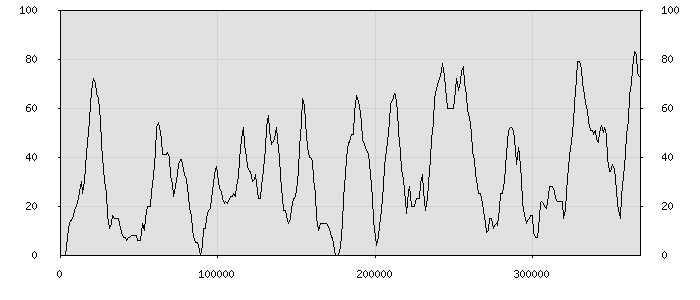 (по горизонтали: счётчик знаков; по вертикали: процент диалогов; размер скользящего окна: знаков, шаг: 1000 знаков) |