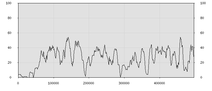(по горизонтали: счётчик знаков; по вертикали: процент диалогов; размер скользящего окна: знаков, шаг: 1000 знаков) |